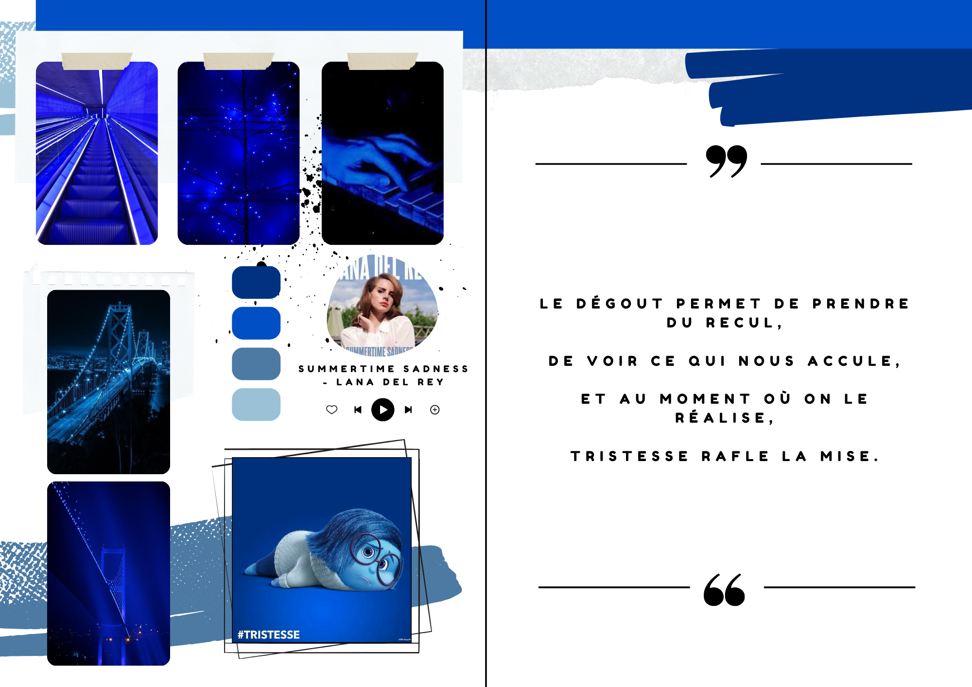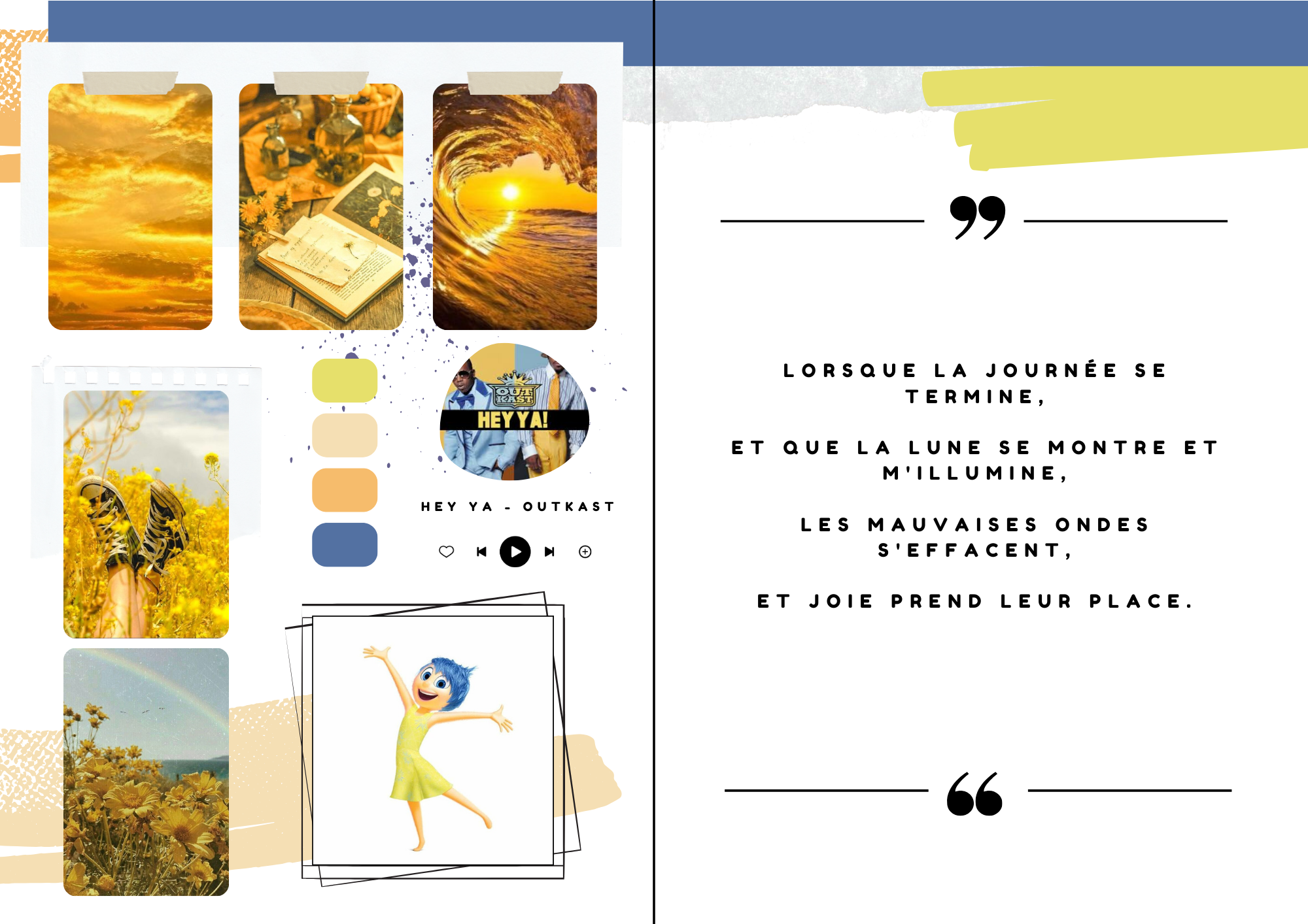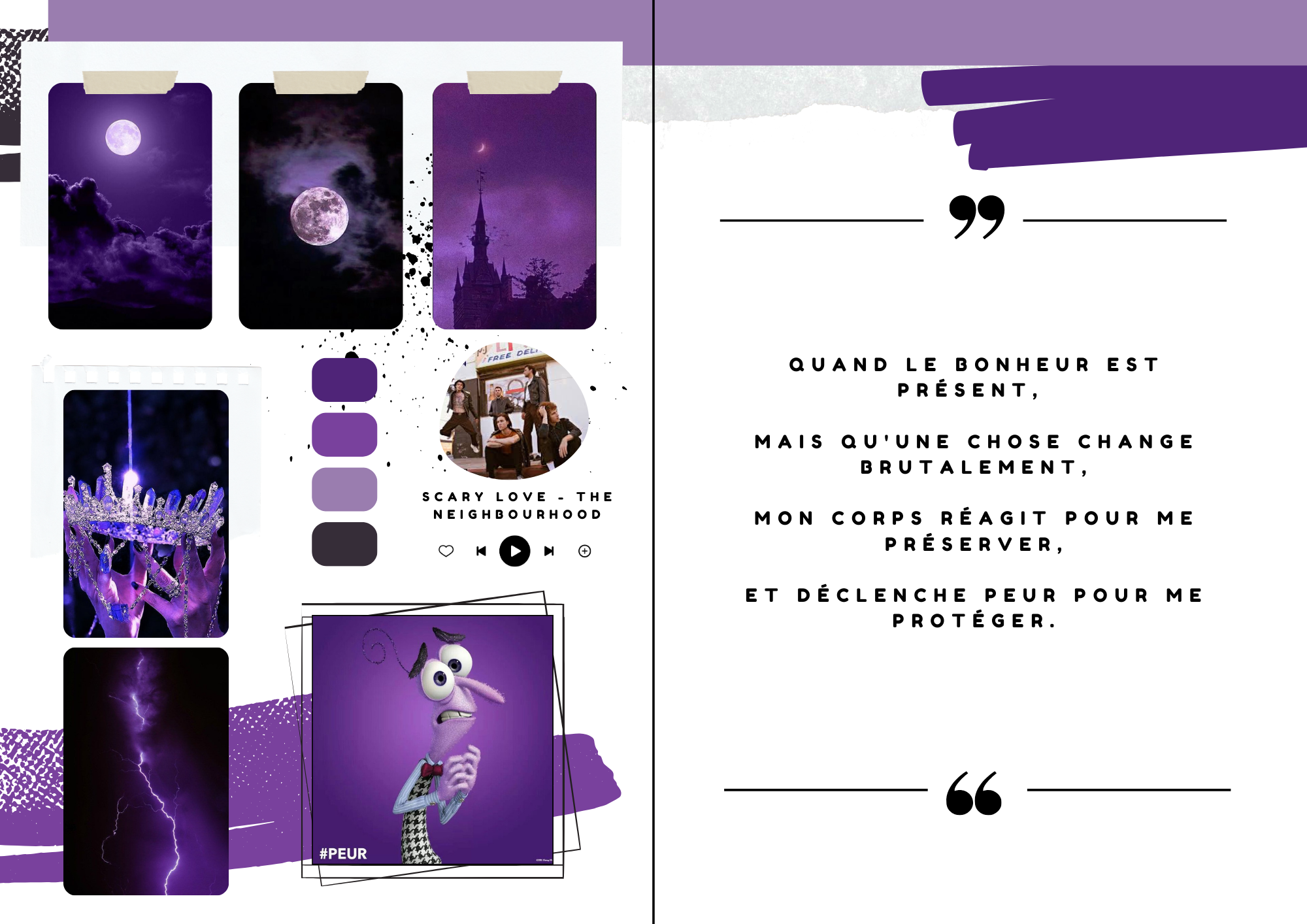Sur la gauche j’ai mis des éléments d’esthétique correspondant à la couleur des personnages, une petite palette de couleur, la photo du personnage et enfin une chanson qui, selon moi, me rappel l’émotion.