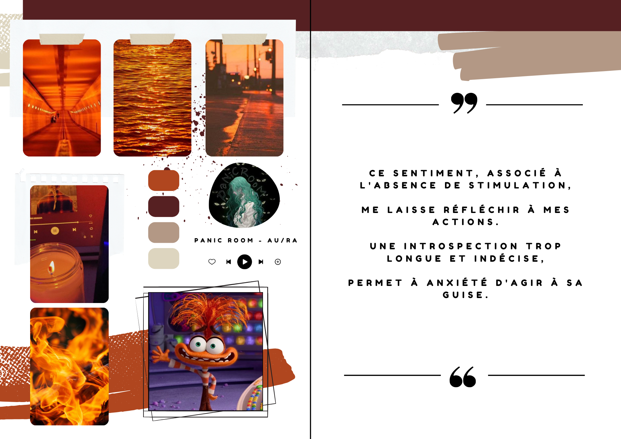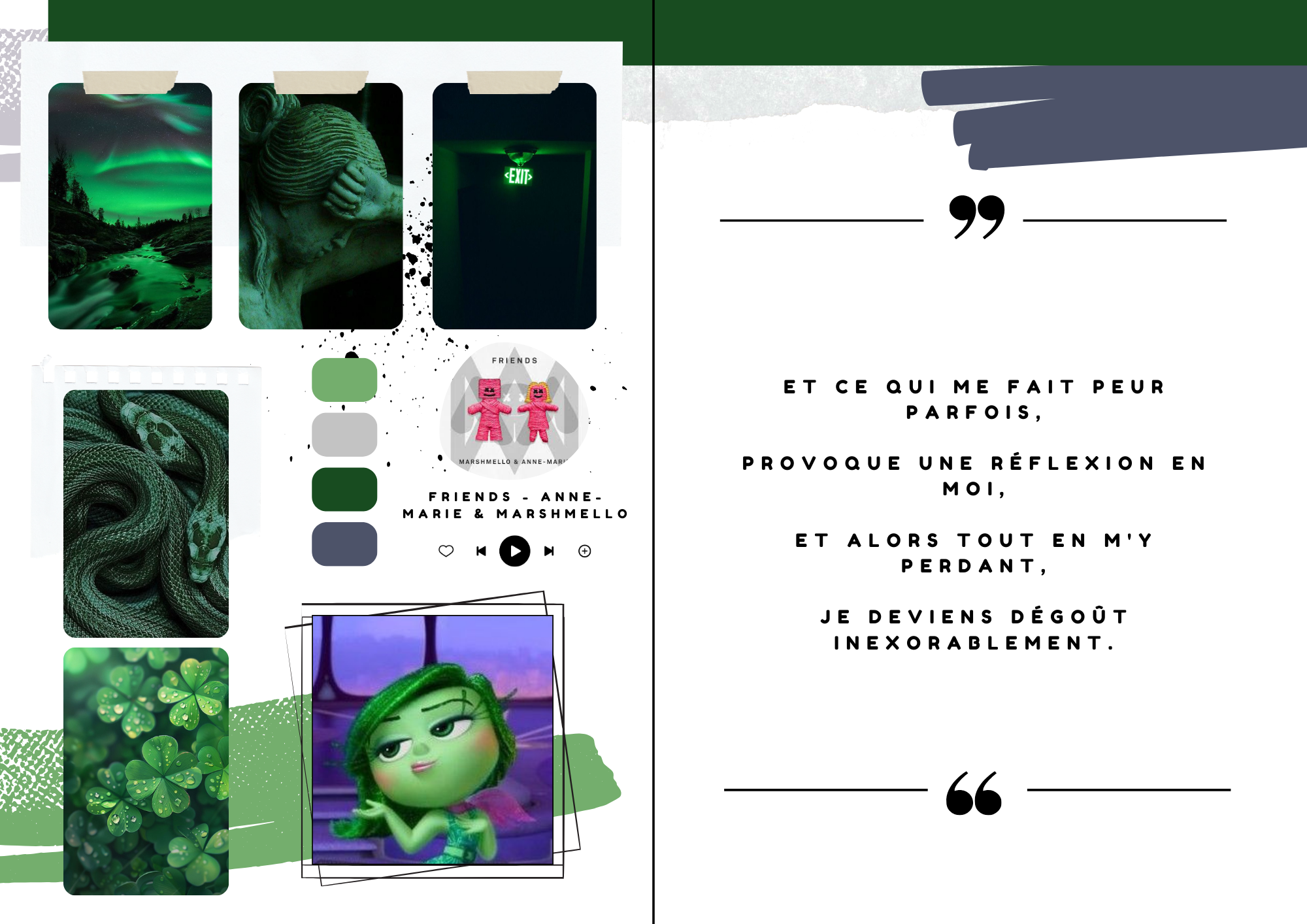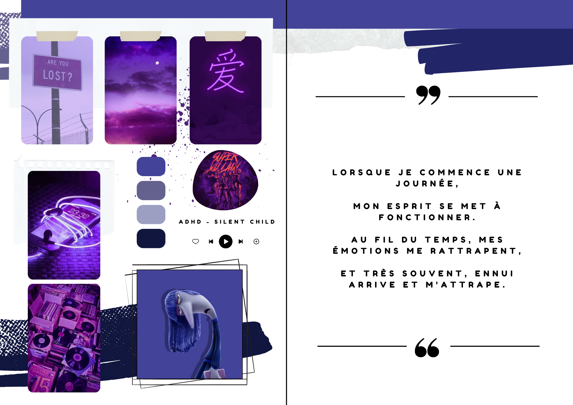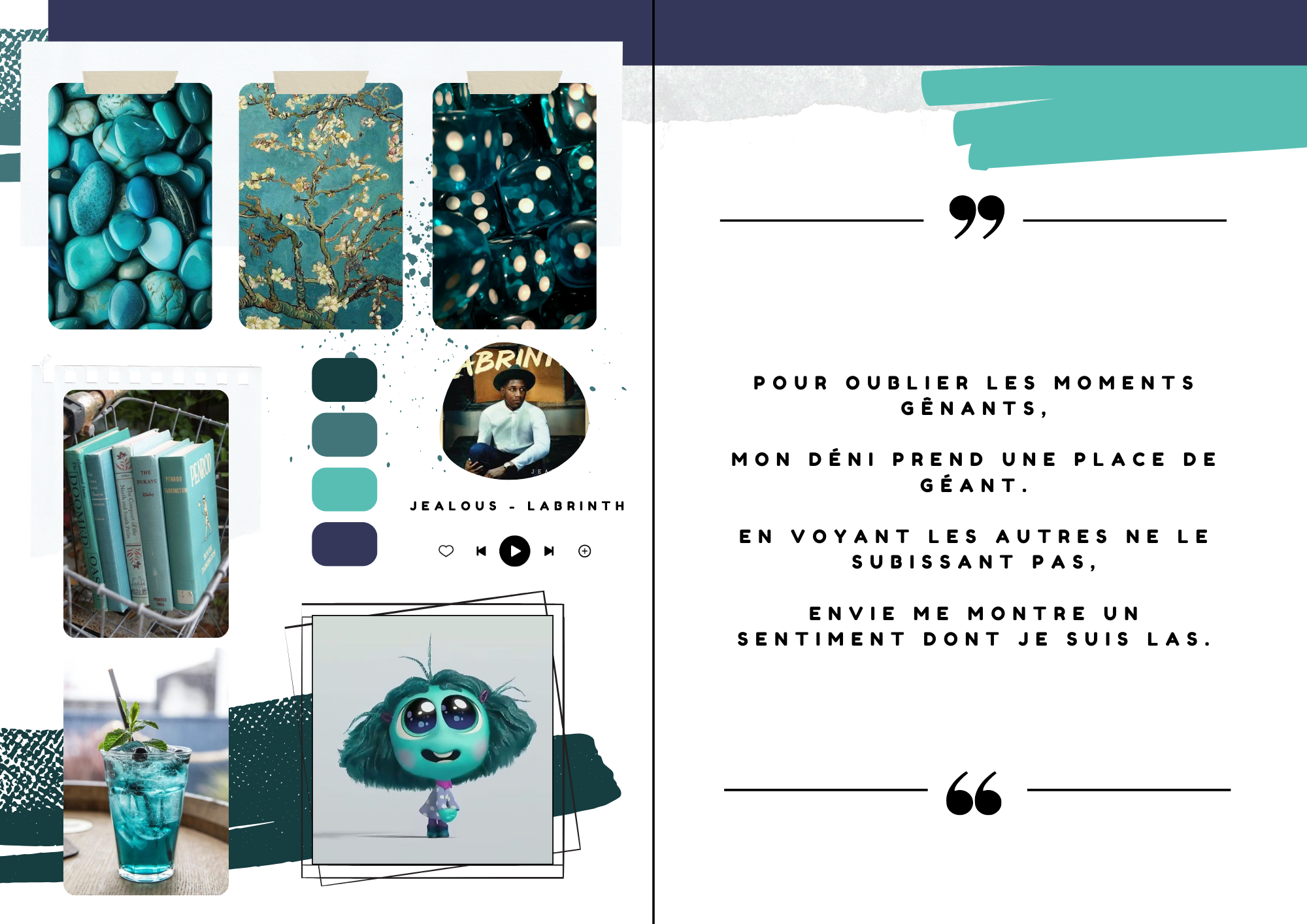 Sur la gauche j’ai mis des éléments d’esthétique correspondant à la couleur des personnages, une petite palette de couleur, la photo du personnage et enfin une chanson qui, selon moi, me rappel l’émotion.